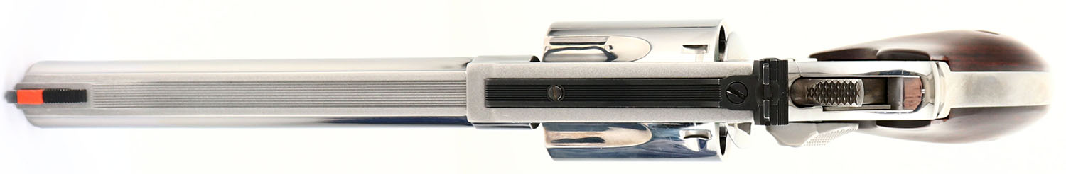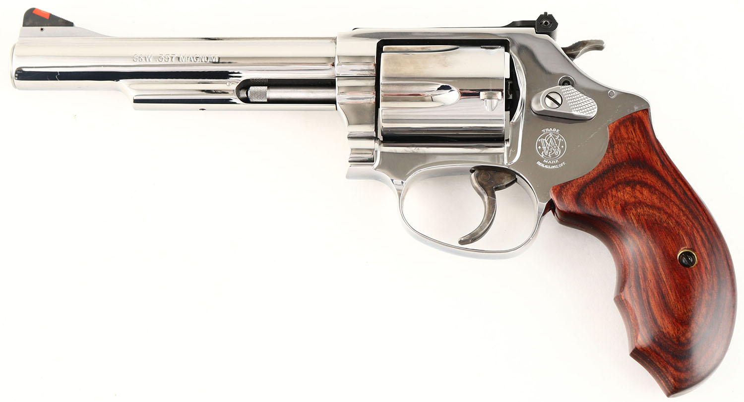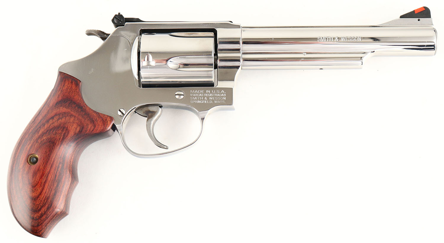 CASED, Smith & Wesson, Model 60-18, CAL; 357 MAG, MFG: Modern, SN: DBX7053, Double Action Revolver, 5'' barrel. The original wood grips are excellent. The original nickel finish is excellent, with a mirror-like finish. Bore is excellent. Adjustable rear sight & elevated serrated blade front sight with orange insert. Comes in factory box, with related paperwork. FFL Req. - Value: 500 to 700