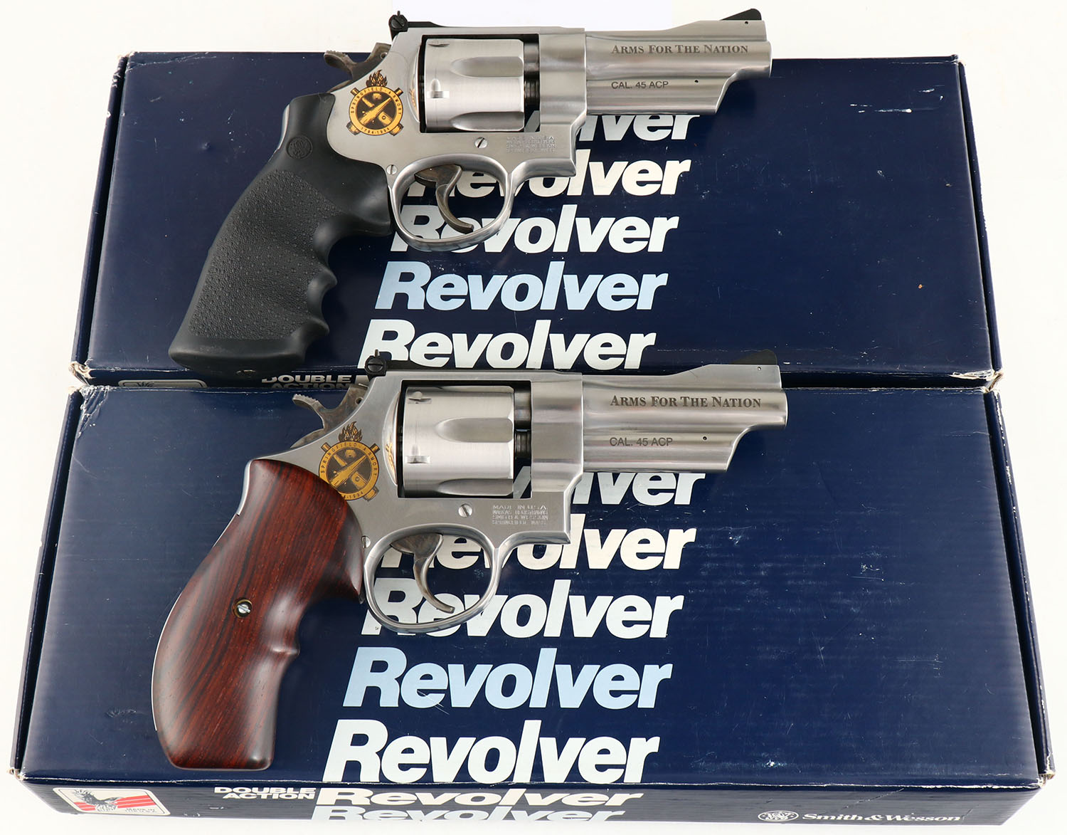 2) BOXED, Smith & Wesson, Model 625-4 - Arms for the Nation: 200th Anniversary of Springfield Armory. CAL: 45 ACP, MFG: 1994, SN: SAC0075, Double Action Revolver, 4'' barrel. The ergonomic smooth wood grips are excellent. The stainless steel finish is excellent. The right side of the frame has a gold S.A cross cannons & flaming cannonball emblem that reads ''SPRINGFIELD ARMORY 1794-1994''. The right side of the barrel is marked '' ARMS FOR THE NATION'' over, ''CAL.45 ACP''. The right side of the frame has the S&W trademark logo. The case-hardened trigger & hammer retain slightly faded, but visible case-colors. Bore is excellent. Adjustable rear sight & ramp elevated serrated blade front sight. Comes in SN matching box, with a good amount of moon clips & extractor tool. This is two of two consecutive lots. Please reference the previous lot for the first gun of a sequential serial number set. FFL Req. - Value: 1400 to 2400