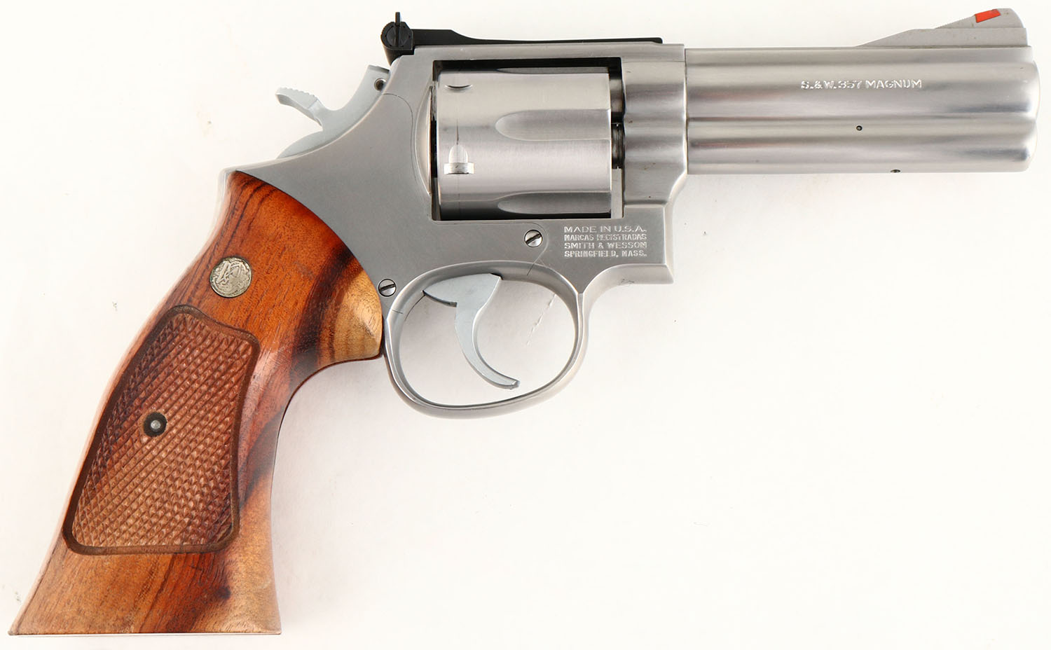 Smith & Wesson, Model 686, CAL: 357 MAG, MFG: Modern, SN: AEJ0811, Double Action Revolver, 4 1/8'' barrel. The S&W logo medallion checkered wood grips are excellent. There are minor handling marks & areas of finish thinning dull. The stainless steel finish is excellent overall, with minor handling marks. Bore is excellent. Adjustable rear sight & elevated blade front sight with orange insert. FFL Req. - Value: 500 to 700