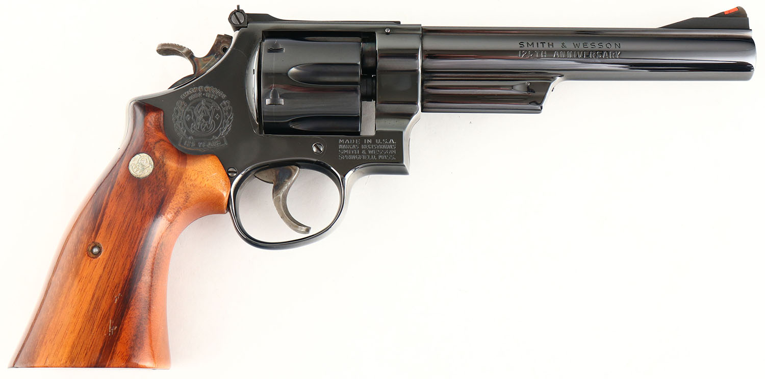 CASED, Smith & Wesson, Model 25-3 125th Anniversary Edition, CAL: .45 LC, MFG: 1977, SN: S&W9788, Double Action Revolver, 6 1/2'' barrel. The S&W logo medallion Goncalo Alves smooth wood grips are excellent. The metal blue finish rates 99% overall. Bore is excellent. Adjustable rear sight & ramp elevated serrated blade front sight, with orange insert. The right side of the barrel is marked in two lines ''SMITH & WESSON 125TH ANNIVERSARY'', the left side of the barrel is marked ''.45 CALIBER'' & the 125th Anniversary seal can be found on the right side of the frame. The revolver is accompanied by ''125 Years of Smith & Wesson'' book by Roy G Jinks, inside a S&W 125th Anniversary Presentation case, with commemorative medallion. The case & accessories are excellent. A complete 125th Anniversary set. Only 10,000 produced. FFL or C&R Req. (C&R Eligible Commemorative) - Value: 1000 to 1500