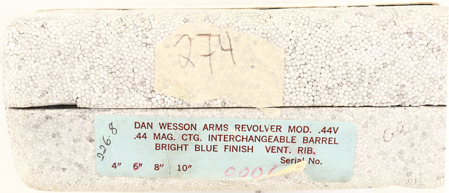 BOXED Dan Wesson Arms, Model 44V, CAL:.44 MAG, MFG 1968-1991, SN: 000656, DA Revolver Pistol, 6'' barrel The DW logo medallion smooth wood grips are excellent. The original metal blue rates 98%, and while there is little to no loss, there is some discoloration to the bluing. Bore is excellent. Adjustable rear sight & serrated blade front sight, with orange insert. Comes in factory styrofoam, with cardboard sleeve. Box has related paperwork, tool, barrel gauge tool & paperwork. FFL Req. - Value: 700 to 1000