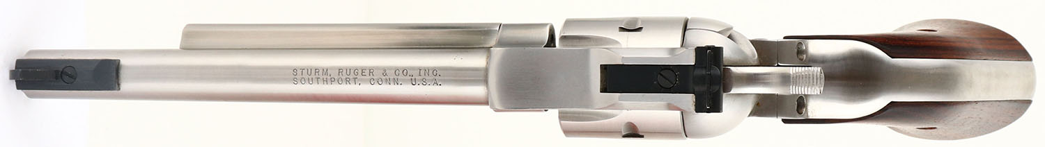 BOXED, Ruger, New Model Super Single Six Convertible, CAL: 22LR/22MAG, MFG: 1974, SN: 62-71513, Single Action Revolver, 6 1/2'' barrel. The Ruger logo medallion wood grips are excellent. The logo medallion has some spotting & light corrosion. The stainless steel finish is excellent overall. Bore is excellent. Adjustable rear sight & elevated serrated blade front sight. Comes in original box, with related paperwork, wax paper & .22 MAG cylinder in original pouch. FFL or C&R Req. - Value: 400 to 600