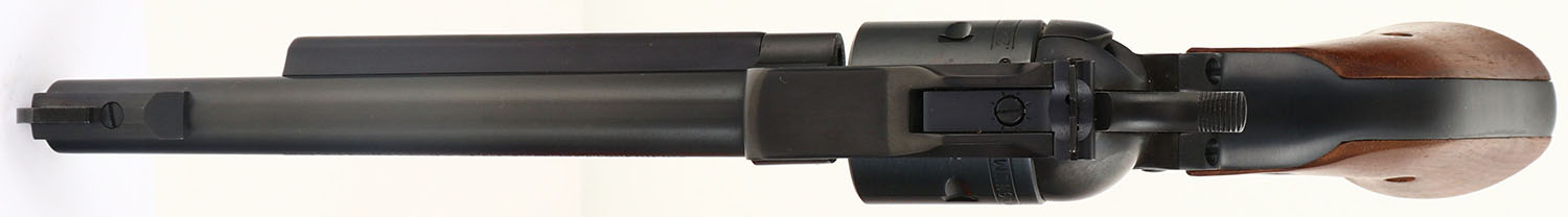 Ruger, New Model Single Six Convertible, CAL: 22LR/22 MAG, MFG: 1979, SN: 67-01295, Double Action Revolver, 6 1/2'' barrel. The Ruger logo medallion wood grips are excellent. The original metal blue finish rates 99%. Bore is excellent. Adjustable rear sight & elevated serrated blade front sight. Comes in a period correct box, with incorrect Blackhawk label printed on the box, no label & outer cardboard sleeve. Box has related paperwork, wax paper & .22 LR cylinder in factory pouch. FFL or C&R Req. - Value: 450 to 650