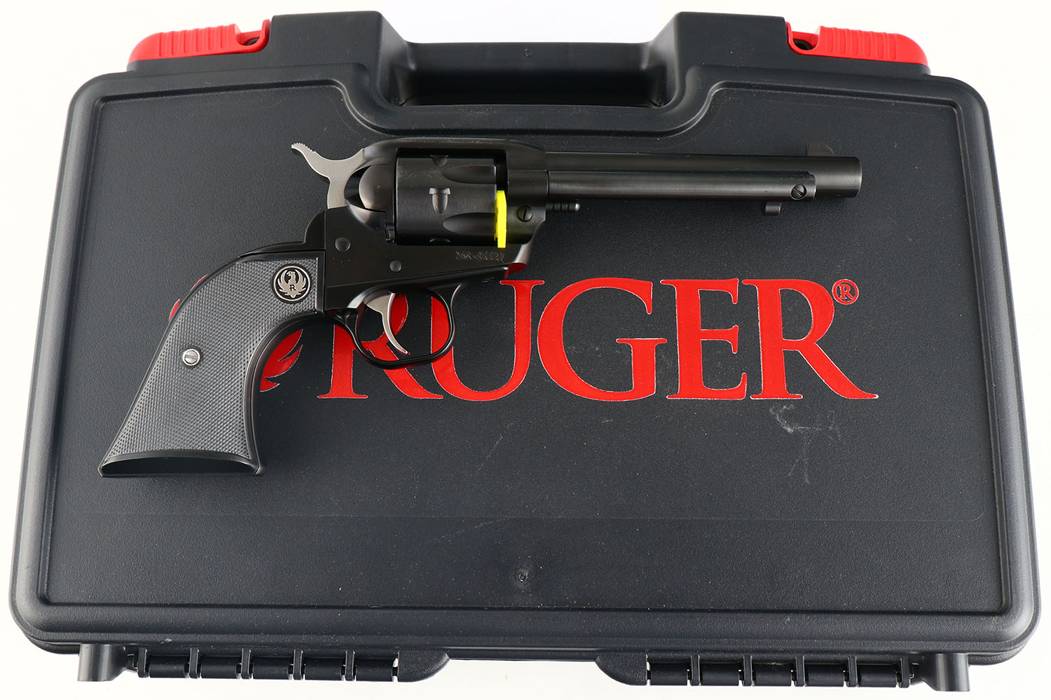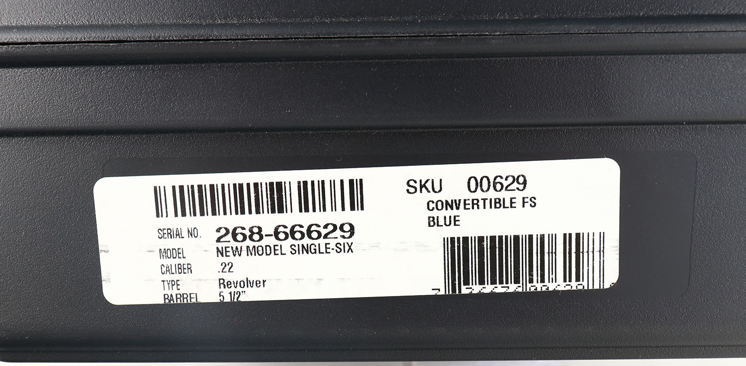 NEW CASED Ruger, New Model Single Six Convertible, CAL: .22LR/.22 MAG, MFG: Modern (2024) , SN: 268-66629, Single Action Revolver, 5 1/2'' barrel. The Ruger logo medallion checkered plastic grips are mint. The metal blue finish rates 100% overall. Bore is excellent. Integral rear sight & blade front sight. Comes in factory hard case, with .22 MAG cylinder, related paperwork & lock/key. NIB. These revolvers retail for $829. FFL Req. - Value: 500 to 800