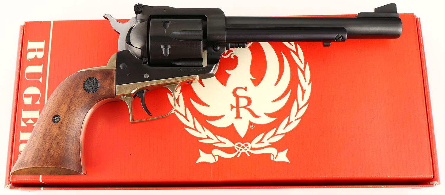 BOXED, Ruger, New Model Blackhawk, CAL: 41 MAGNUM, MFG: 1977, SN: 41-12699, Single Action Revolver, 6 1/2'' barrel. The Ruger logo medallion wood grips are excellent. The original metal blue finish rates 99% overall. The Ruger NMBH brass frame is very good, with some light staining throughout. Bore is excellent. Adjustable rear sight & block elevated serrated blade front sight. The Ruger brass frame & grips that are currently on the revolver were put on by a gunsmith in 1977, with the original sales receipt included. The brass frame does not carry the original ''MR-3DB'' cast marking. The factory grip frame & grips are also included. Comes in original box, with related paperwork, wax paper & outer cardboard sleeve. FFL Req - Value: 900 to 1400