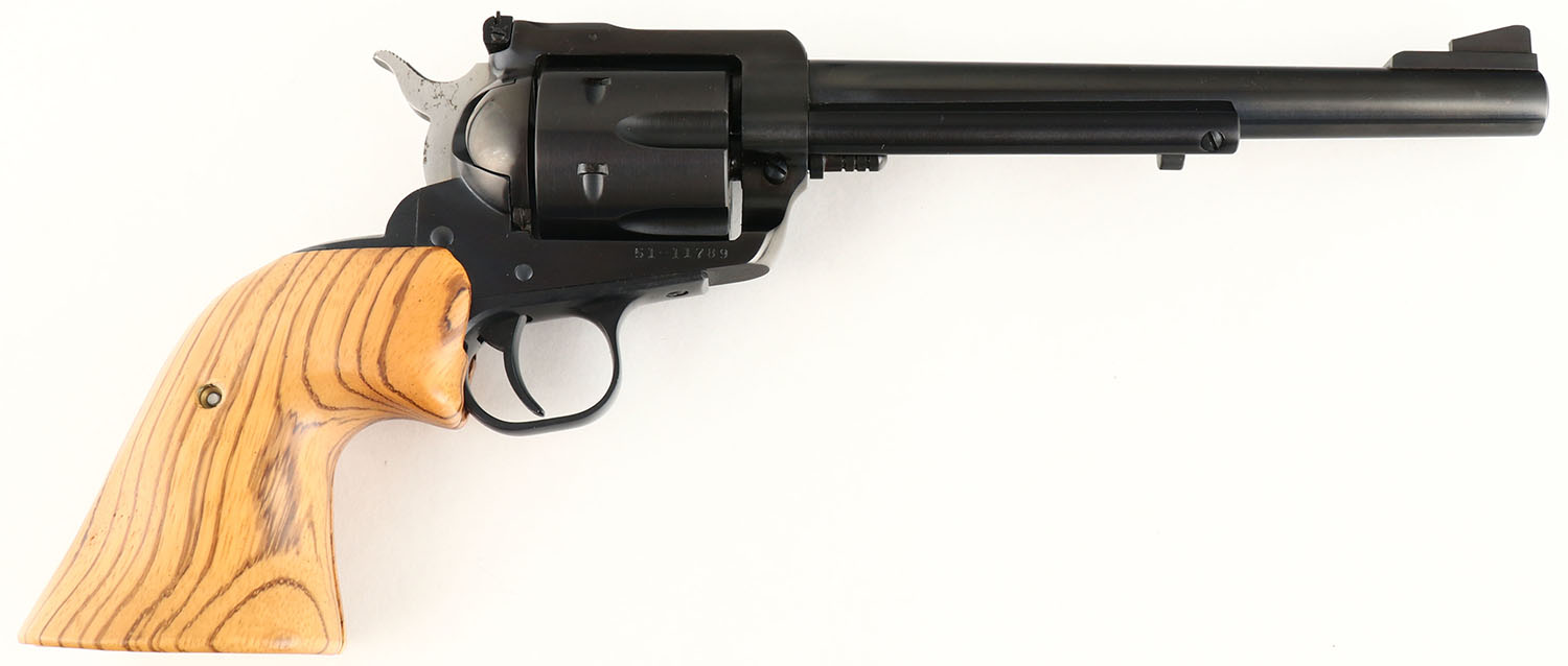 Ruger, New Model Blackhawk, CAL: 30 Carbine, MFG: 1977, SN: 51-11789, Single Action Revolver, 7 1/2'' barrel. The oversized replaced wood grips are excellent. The original metal blue finish rates 99% overall. Bore is excellent. Adjustable rear sights & block elevated serrated blade front sight. FFL Req. - Value: 550 to 750