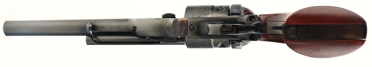 BOXED, Cimarron Firearms (Uberti), Model 60 Richards-Mason Edition, CAL: 44 COLT, MFG: Modern, SN: X37034, Single Action Revolver, 8'' barrel. The smooth wood grips are excellent. The metal blue finish on the barrel, cylinder & trigger guard rates 99%+. The case-hardened frame retains vivid case-colors. Laser engraved cylinder. Bore is mint. Integral v-notch rear sight on the hammer & blade front sight. Comes in original box. FFL Req. - Value: 500 to 700