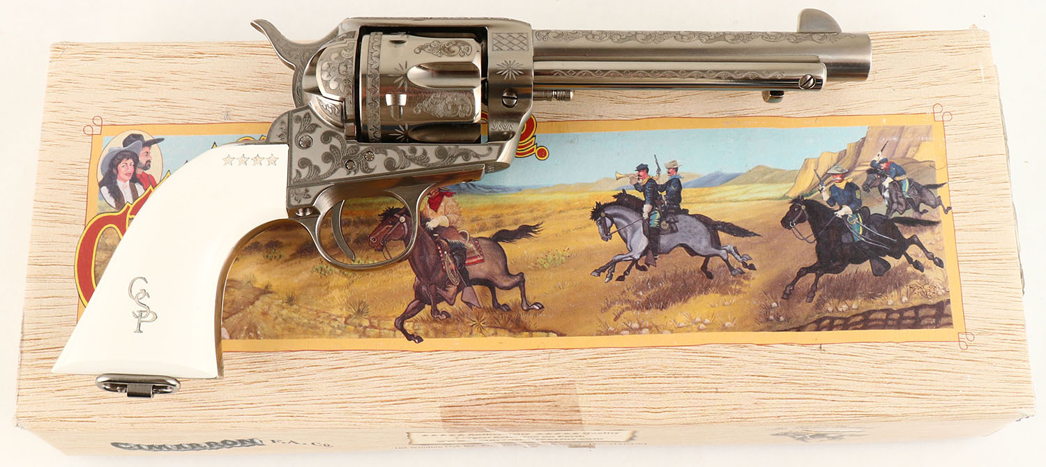 NEW BOXED, Cimarron Firearms (Pietta), 1873 SA Frontier Model Gen. George S. Patton Engraved, CAL: 45 COLT, MFG: Modern, SN: E072960, Single Action Revolver, 5 1/2'' barrel. The faux ivory grips are excellent. The top of the right grip displays (4) stars & the initials ''GSP'' are stamped below. The nickel finish is excellent overall. The entirety of the revolver displays crisp laser engravings of decorative scroll. Bore is mint. Integral square-notch rear sight & dorsal blade front sight. Sling loop present. Comes in original box, with related paperwork. FFL Req. - Value: 750 to 950
