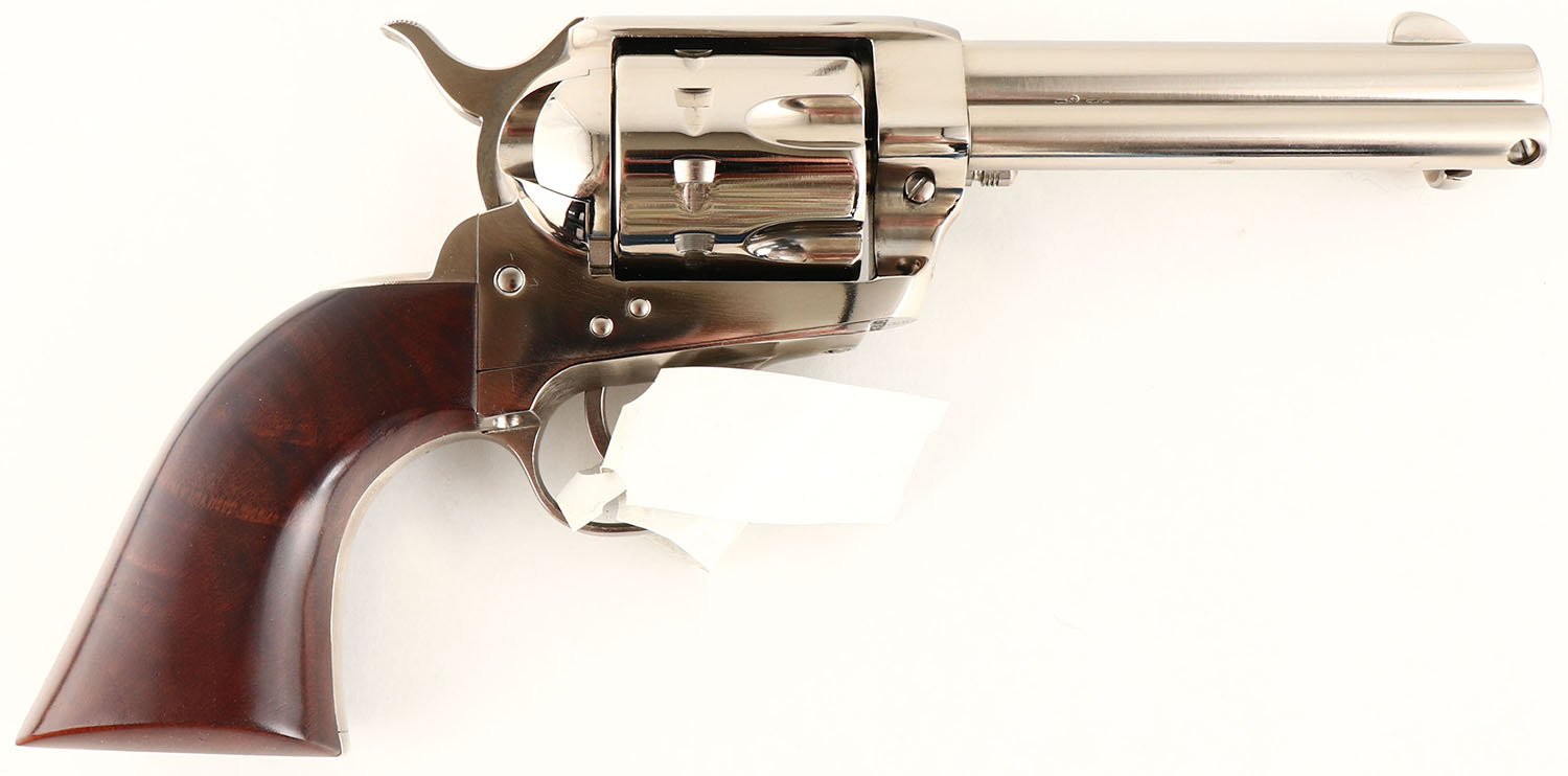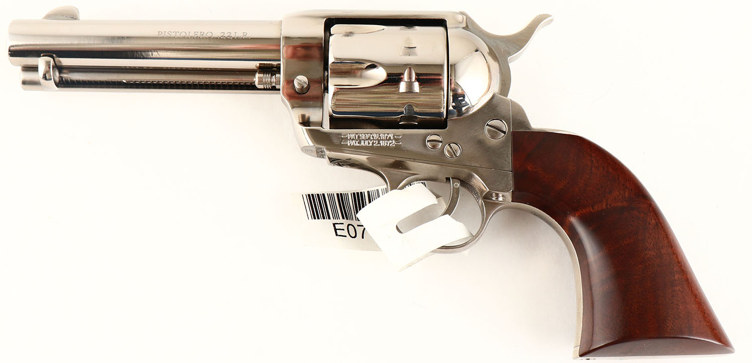NEW BOXED, Cimarron Firearms (Pietta), 1873 SA ''Pistolero'', CAL: 22LR, MFG: Modern, SN: E075218, Single Action Revolver, 4 3/4'' barrel. The smooth wood grips are excellent. The nickel finish is excellent overall. Bore is mint. Integral square-notch rear sight & blade front sight. 10 Shot Cylinder. Original hang tag still attached. Comes in original box, with related paperwork. FFL Req. - Value: 500 to 600