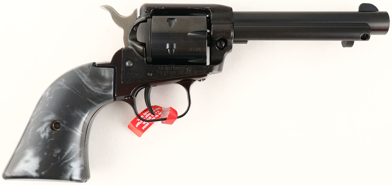 NEW BOXED, Heritage, Rough Rider - Black Pearl , CAL: 22LR, MFG: Modern, SN: 3PH144767, Single Action Revolver, 4 3/4'''' barrel. The synthetic black pearl grips are excellent. The metal blue finish on the barrel & cylinder rates 99%. Frame has factory matte black finish, with spotting underneath. These types of finishes are typical amongst most all Heritage products. Bore is excellent. Integral square notch rear sight & blade front sight. Factory hang tag still attached, hammer safety bar & plastic cylinder disc still present. Comes in original box, with related paperwork & lock. NIB. FFL Req. - Value: 120 to 170