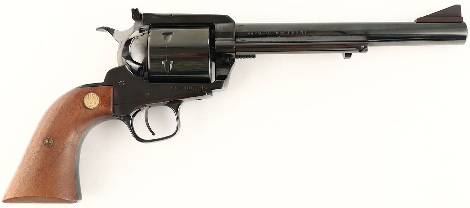 U.S Arms Co. Abilene (Model 508 AB), CAL: 44MAG, MFG: 1970's, SN: 50-002893, Single Action Revolver, 7 1/2'' barrel. The original wood grips with inlaid US brass medallions are excellent. The metal blue finish rates 98% overall. There is some discoloration to the bluing, but no loss. Bore is excellent, near mint. Adjustable rear sight & large serrated blade front sight. FFL Req. - Value: 500 to 800