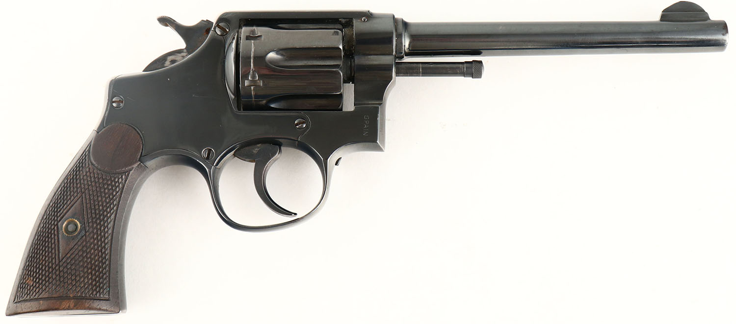 T.A.C (Spain), Revolver, CAL: 32-20, MFG: 1920-36, SN: 222543, Double Action Revolver, 6 1/8'' barrel. The original checkered wood grips are very good & solid. There are contusions, scrapes & dings to the finish. The metal blue finish rates 95% on the barrel & 97% on the frame, with visible handling marks & a couple areas of light spotting toned to a brown patina. Bore is excellent. U-notch rear sight & blade front sight. TAC was one of the better brands of S&W clones made in Spain. They imported into the U.S. in such large quantities that they almost put S&W out of business. FFL or C&R Req. - Value: 200 to 400