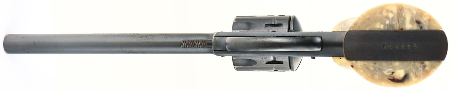 Harrington & Richardson, Model 922, CAL: 22, MFG: 1950's 60's, SN: N59528, Double Action Revolver, 6'' barrel. The H&R checkered multi-color plastic grips are excellent. The original metal blue finish rates 90% on the barrel & 85% on the frame, with intermittent spotting/speckling toned to a brown patina. Bore is excellent, with some visible wear. Square notch rear sight & blade front sight. Cylinder does not rotate when trigger is pulled or hammer is cocked. Internal parts issue. Needs to be inspected by gunsmith before use. SOLD AS IS NO RETURNS. FFL or C&R Req. - Value: 100 to 200