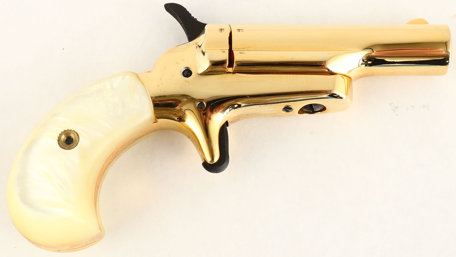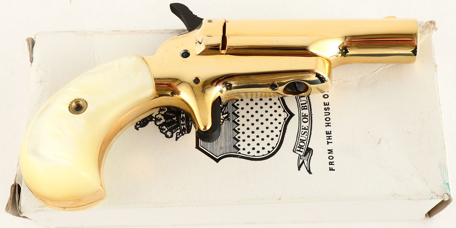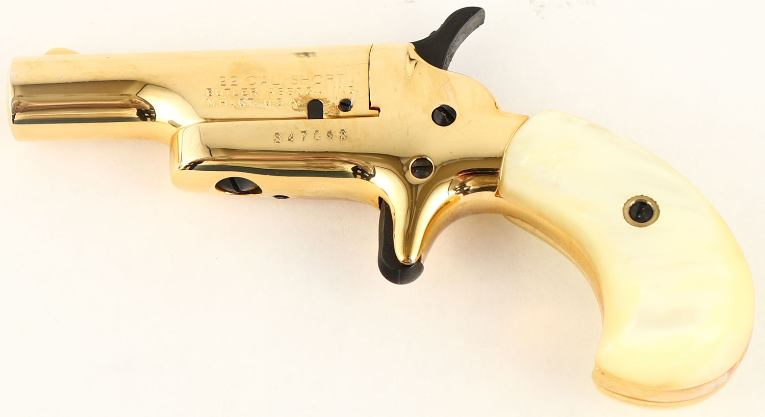 BOXED, Butler, Derringer, CAL: 22 SHORT, MFG: Modern, SN: B47048, Single Action Pistol, 2 3/8'' barrel. The faux pearl grips are excellent. The high polish gold tone finish rates 99% overall, with minor speckling on the left side of the barrel. Bore is very good. Blade front sight. Comes in factory box. FFL Req. - Value: 50 to 150