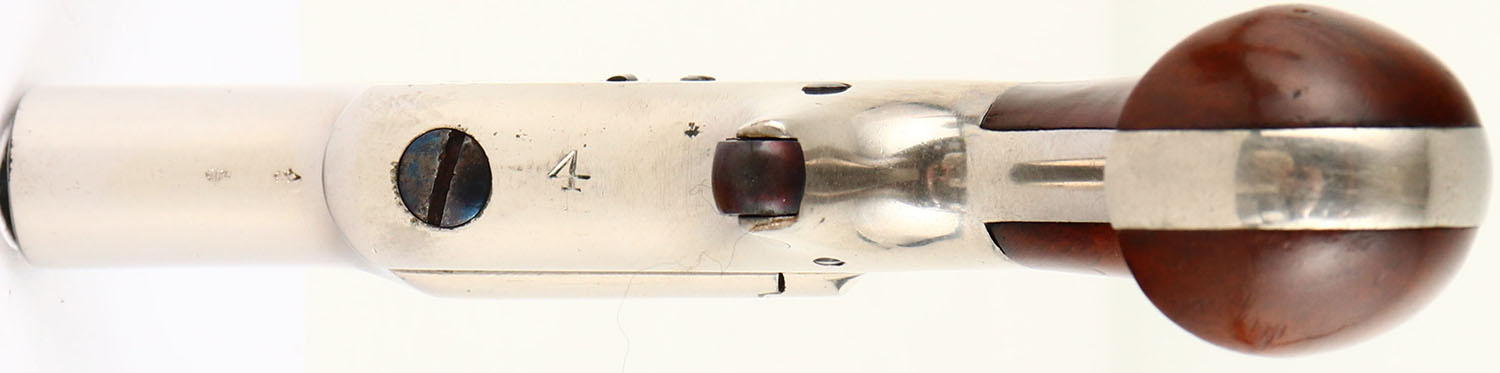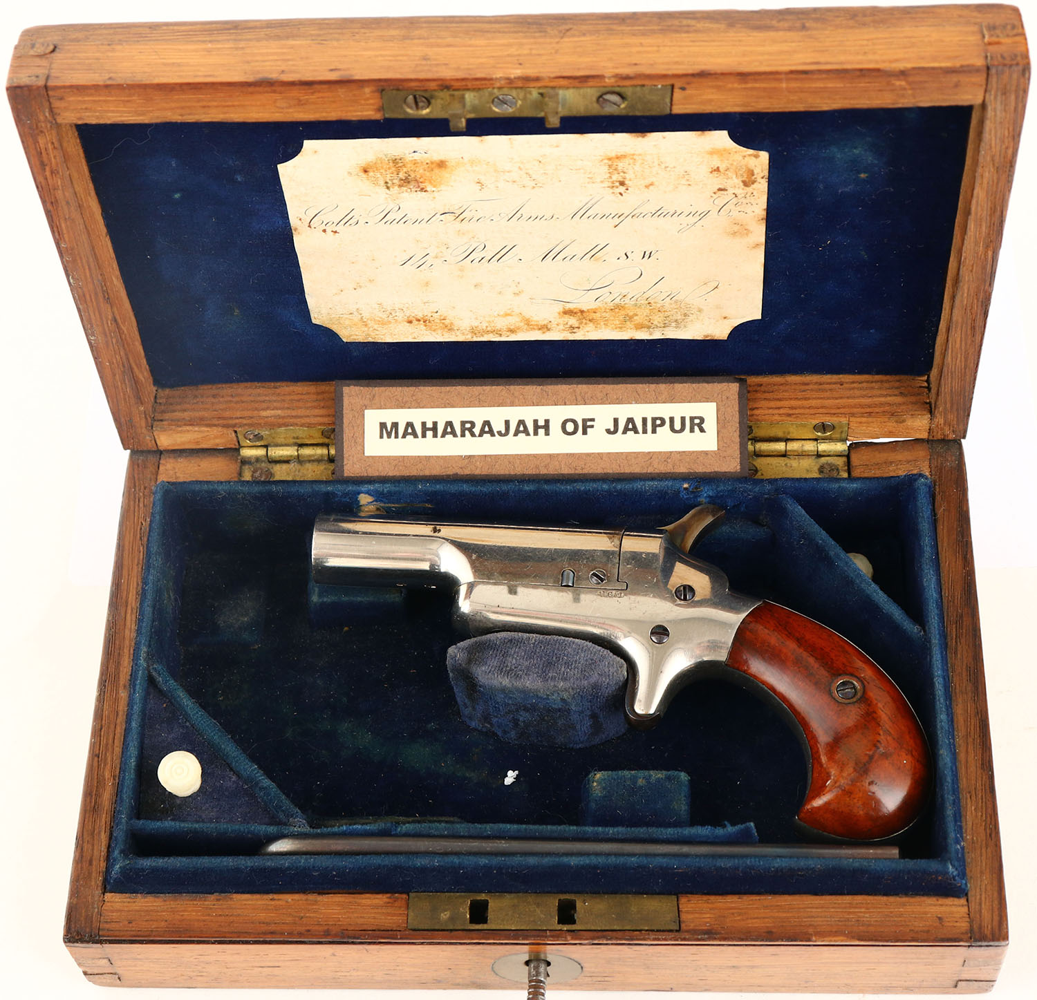 CASED, Colt, Thuer Derringer (3rd Model), CAL: .41 RF, MFG: 1870's-80's, SN: 1589, Single Shot Pistol, 2 1/2'' barrel. The bird's head wood grips are excellent. There are a few minor dings to the finish. The original nickel finish rates 98% overall, with only a couple small spots of flaking. The case-hardened hammer retains excellent case colors. Bore is good, with intermittent spotting & speckling. Blade front sight. The backstrap is engraved, although it can't be attributed to anyone due to lack of evidence from research. The backstrap is engraved with ''S.M.S.B R G.C.S.I.J''. The special order engraving is consistent with examples of Colt factory engraving. Comes in original derringer wood case, with blue interior & Colt label with London address. The case is originally for a pair of derringers, but only one is present. Included in the case is a small plaque that reads ''MAHARAJAH OF JAIPUR''. A high condition Derringer with an untold story. Antique, No FFL Req. - Value: 1000 to 1500