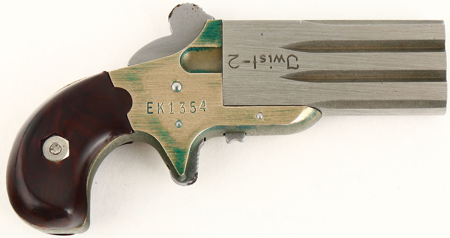 BOXED, Estul, Twist-2, CAL: 22 S, MFG: N/A, SN: EK1354, Single Shot Pistol 2'' revolving barrels. The synthetic faux wood grips are excellent. The brushed stainless steel barrels are very good, with intermittent spotting on one side. The brass frame is very good, with areas of staining on the right side. Bores are very good. No sights. Comes in factory box, with owners manual. FFL Req. - Value: 50 to 150