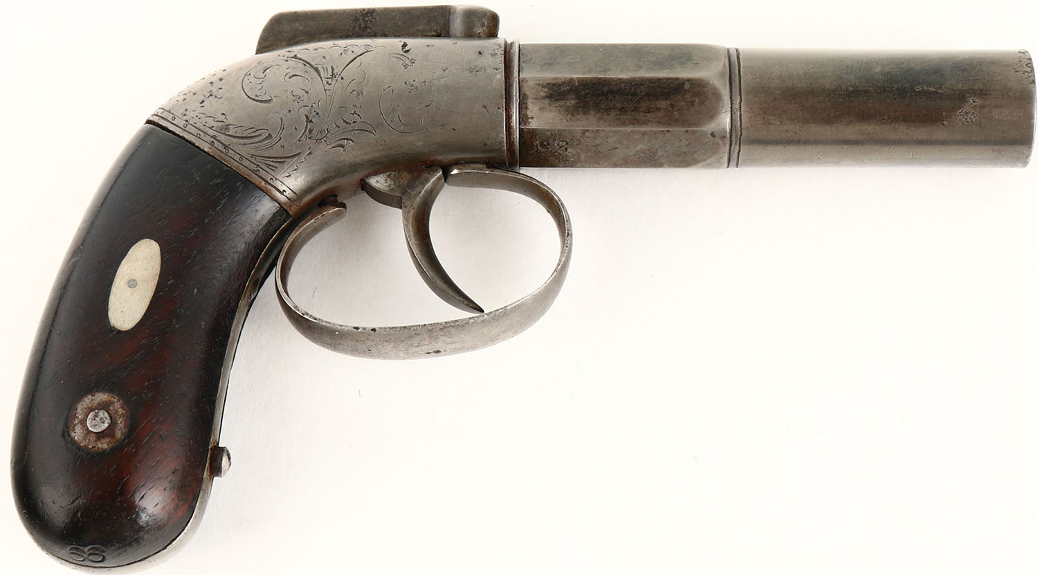 Allen & Thurber, Bar Hammer Pistol -2nd Version, CAL: 36, MFG: 1837-42, SN: 30 (barrel, frame & grips), Single Shot Percussion Revolver, 3'' half octagon half round screw-on barrel. The barrel flats are marked ''ALLEN & THURBER'', ''GRAFTON MASS'', ''CAST STEEL'', & ''30'' (full SN). The full Sn can be found on the barrel, inside frame & both grips. The pistols from the Grafton period have the typical angled ''quick drop'' grip with walnut wood & an oval silver inlay. They have the Double Action system from the 1837 patent, which can be observed from the very low positioned tension screw at the bottom of the grip. Although the production of the Bar Hammer pistol was very limited in the Grafton period, it was long enough to distinguish 2 variations. First version: The grip has a wide back strap of 1/2", just like the Tube Hammer. The wooden grips are not held in position by a pin. Second version: The back strap is narrow (1/4") and has pins to hold the wooden grips in position. This narrow back strap design remained in production on all other models without changes. (bpgcollector.com). The original wood grips with inlaid silver plates are very good & solid. There are numerous light scratches & scrapes to the finish. ''66'' is stamped into the bottom of the right grip. We are unsure as to what ''66'' represents, as ''30'' (SN) is marked on the inside of both grips. The original metal blue finish rates 10%, mostly worn to metal gray & toned to a brown patina. The frame is engraved with simple floral scroll patterns. The engraving has worn thin over time. Bore is good, with consistent roughness & light pitting. No sights. These firearms would've been intended for use as a concealable self-defense pistol in the mid-19th Century & also a favorite of miners during the gold rush. Antique, No FFL Req. - Value: 400 to 800