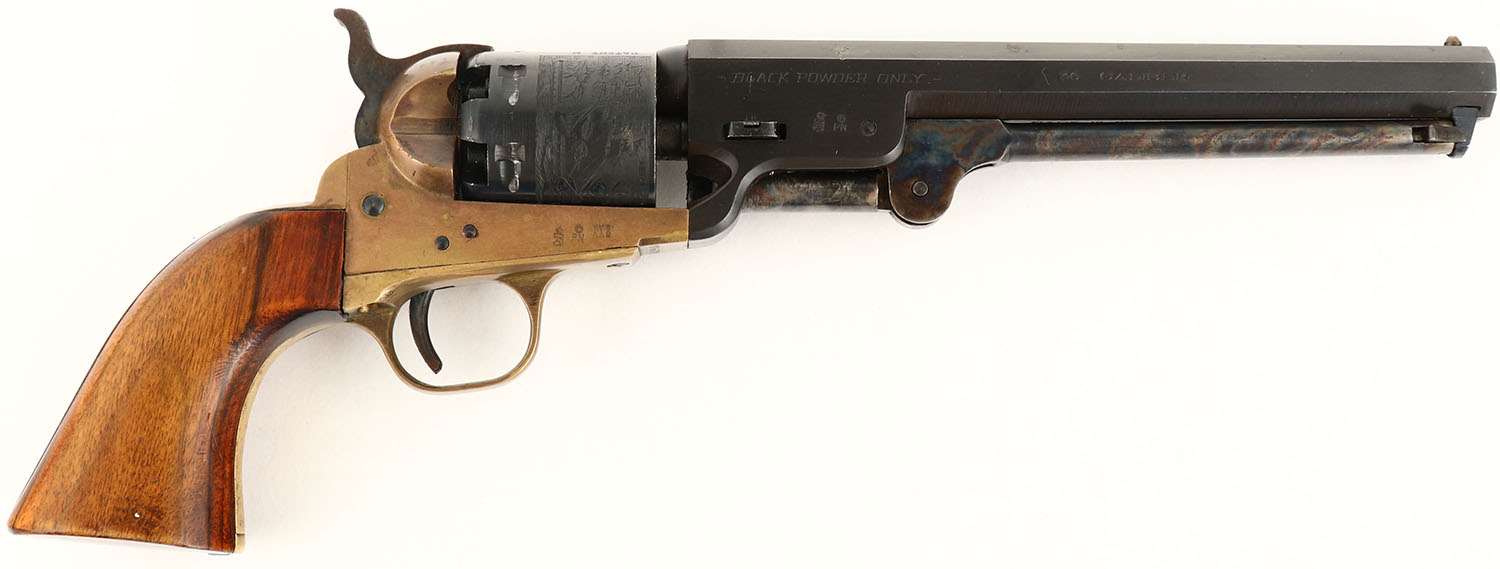 Rigarmi, Model 1851 Navy, CAL: 36, MFG: N/A, SN: 11601, Single Action Percussion Revolver, 7 1/2'' octagon barrel. The original wood grips are excellent. There are minor handling marks to the finish. The metal blue finish on the barrel rates 90% coverage, toned to a brown patina. The brass frame has an aged patina. The case-hardened ramrod retains excellent case-colors. Bore is excellent. Small brass cone front sight. Black powder, No FFL Req. - Value: 100 to 200