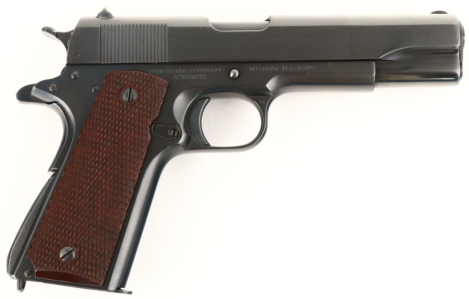Colt, Model: M1911A1, ''UNITED STATES PROPERTY''. Cal: .45 ACP, MFG: 1942, S/N: 785071, Semi-auto pistol, 5'' barrel. A WWII military pistol. The inspector stamp of W.B. is for Colonel Waldemar S. Broberg. He was the Army Inspector of Ordnance from July 1st, 1941 to June 16th, 1942 in the Hartford/Springfield Ordnance District. This pistol is part of the last batch he approved his last month. The gun is also right during the transition era of when the finish went from ''Brushed Blue'' to being parkerized. The ''Coltwood'' plastic grips are excellent & sharp. The rearsenaled metal blue finish rates 99% overall. The darker tone on the front 1/3 of the slide is from that part being hardened to help increase its strength, leading to the metal holding onto the bluing better than the un-hardened section. The left side of the slide is marked with Colt's patent dates, the Rampant Colt logo, & ''COLT'S PT.F.A.MFG.CO.'', ''HARTFORD.CT.U.S.A.''. The right side of the frame is marked ''UNITED STATES PROPERTY'', ''M1911A1 U.S. ARMY'', the S/N, & a ''74'' on the trigger guard. The left side of the frame is marked with the ''WB'' inspector stamp by the slide catch. There is a ''P'' mark by the mag release button, which is just a basic proof mark. The left side of the trigger guard is marked with a ''8'', & a ''VP'' in a triangle stamp, which is the Colt verified proof factory inspection stamp. The bore is excellent, bright & mirror like. The slide holds the small half moon blade front sight, with a U-notch rear sight. Pistol comes with a single blued mag. An overall excellent example of a WWII U.S. Property Colt & one of the last blued M1911's for the military. FFL or C&R Req. - Value: 1500 to 2500