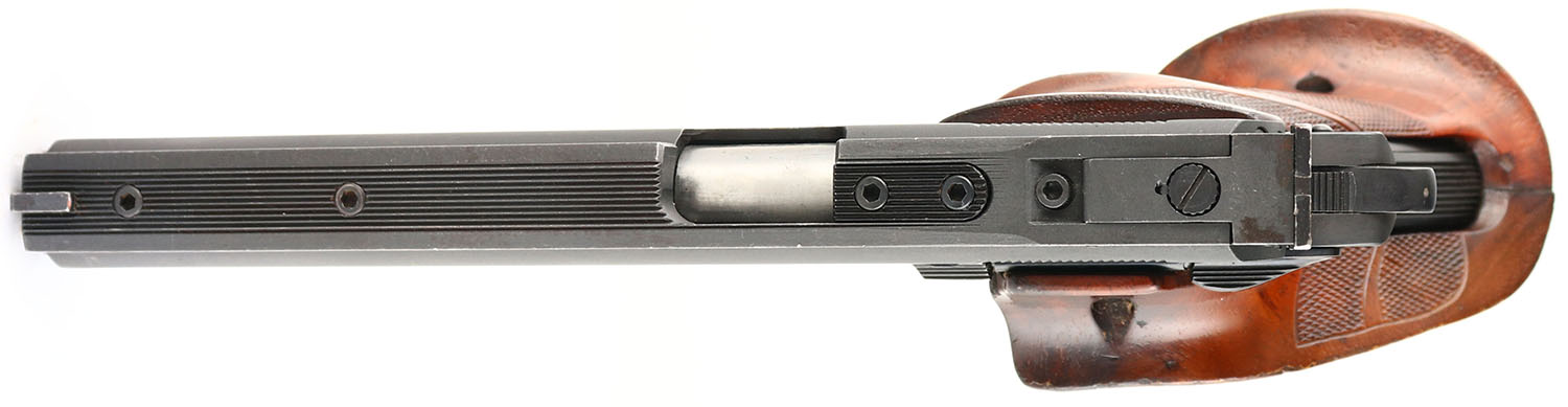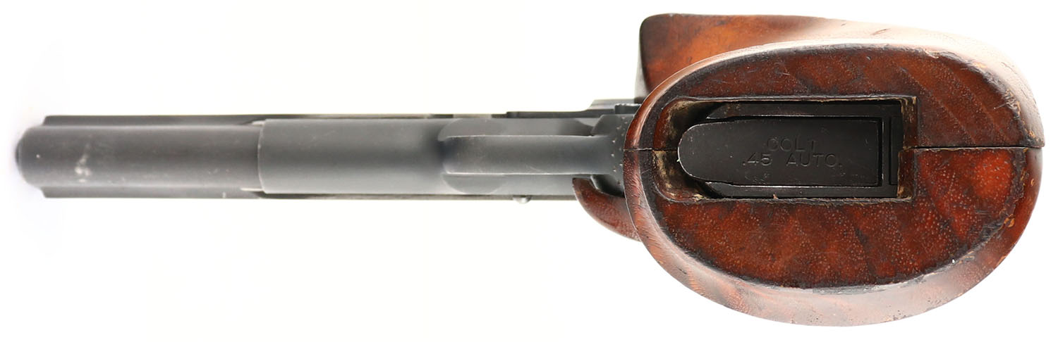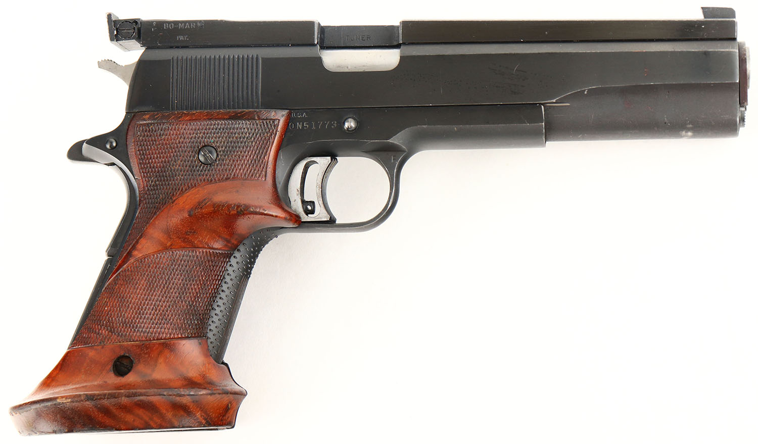 CUSTOM TARGET PISTOL, Colt/Jim Clark, 1911, CAL: 45 ACP, MFG: 1978, SN: 70N51773, Semi-Auto Pistol, upgraded 6'' barrel. This custom target pistol is compiled from a Gold Cup National Match frame & a Jim Clark heavy long slide. The left side of the slide is marked ''CLARK LONG HEAVY SLIDE .45 KEITHVILLE, LA 71047''. The checkered target wood grips are very good. There are contusions, dings, scrapes & areas of flaking finish. The metal blue finish rates 95% overall. Bore is excellent, with visible light wear. The BO-MAR rib holds an adjustable rear sight & blade front sight. Stippled front strap. FFL Req. - Value: 1500 to 2500