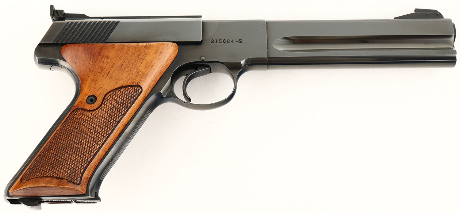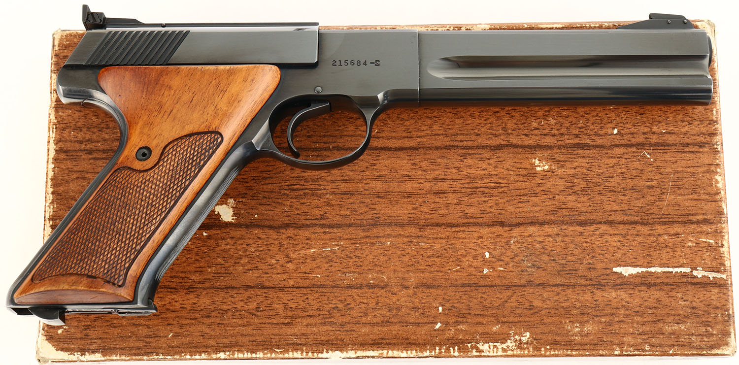 BOXED, Colt, Woodsman 3rd Series Match Target, CAL: 22LR, MFG: 1966-69, SN: 215684-S, Semi Auto Pistol, 6'' heavy barrel. The checkered target grips are excellent. There are minor handling marks to the finish. The original metal blue finish rates 99% on the barrel & the frame rates 95%, with concentrated wear to the front/back straps. Bore is excellent. Adjustable rear sight & pinned blade front sight. Comes in original box, with paperwork. Box has edge & corner wear, with multiple tape repairs to the corners. FFL or C&R Req. - Value: 900 to 1400