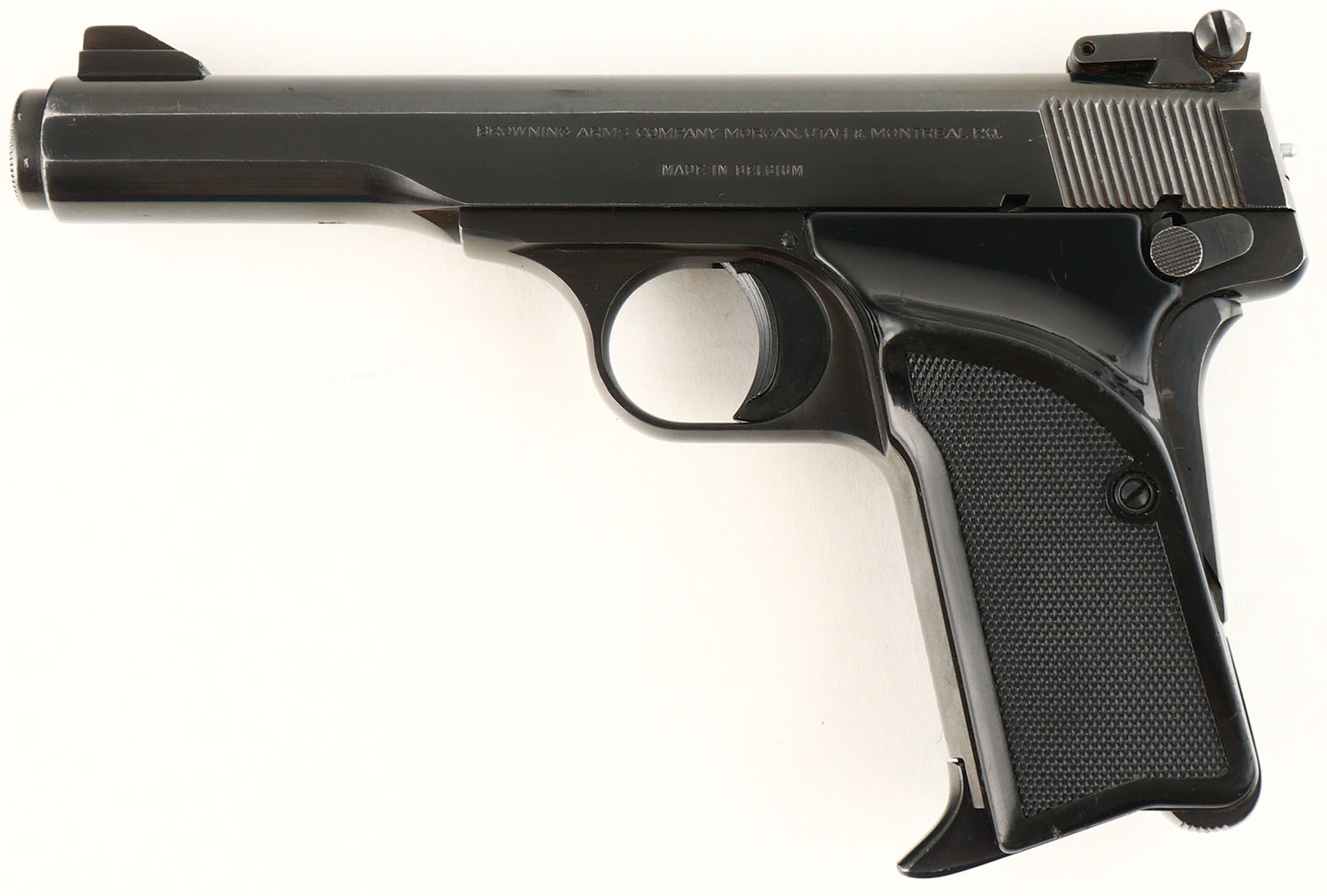 FN Browning, Model 10/71, CAL: .380, MFG: 1972, SN: 72N22253, Semi Auto Pistol, 4 1/2'' barrel. The original Browning checkered plastic grips are excellent. There are handling marks, scrapes & a couple dings. The original metal blue finish rates 97%, with light wear to sharp edges & a couple spots of light speckling. Bore is excellent. Adjustable rear sight & serrated blade front sight. Comes in black leather, red velvet lined Browning soft case, with owners manual. FFL Req. - Value: 400 to 650