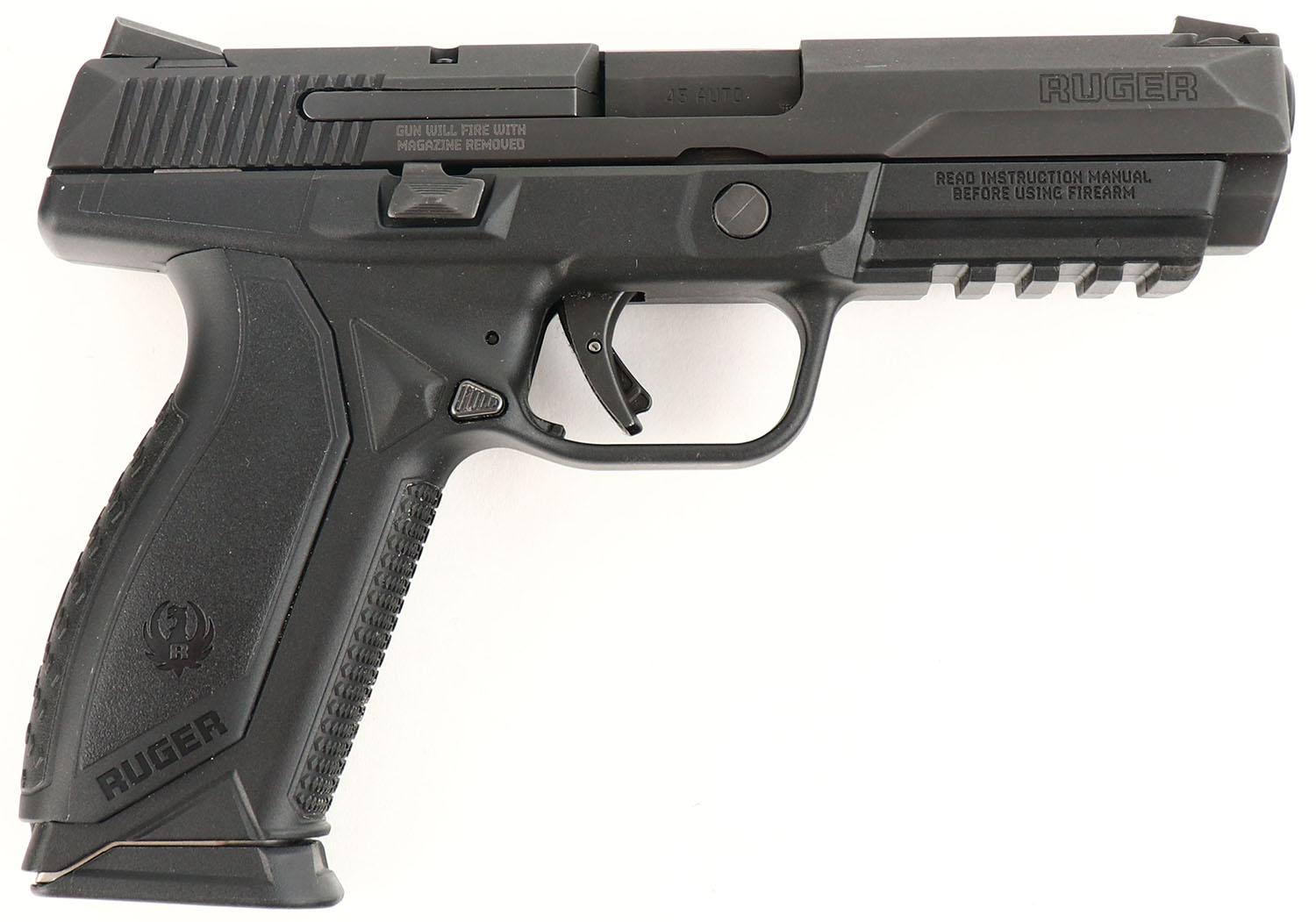 CASED, Ruger, American Pistol - Pro Duty, CAL: 45 AUTO, MFG: Modern, SN: 861-50517, Semi Auto Pistol, 4 1/2'' barrel. The textured polymer grip frame is excellent. The Black Nitride finish on the slide rates 99%. Bore is excellent. Novak's contrast sights. Comes in factory hard case, with two extra mags, grip panels & related paperwork. FFL Req. - Value: 400 to 600