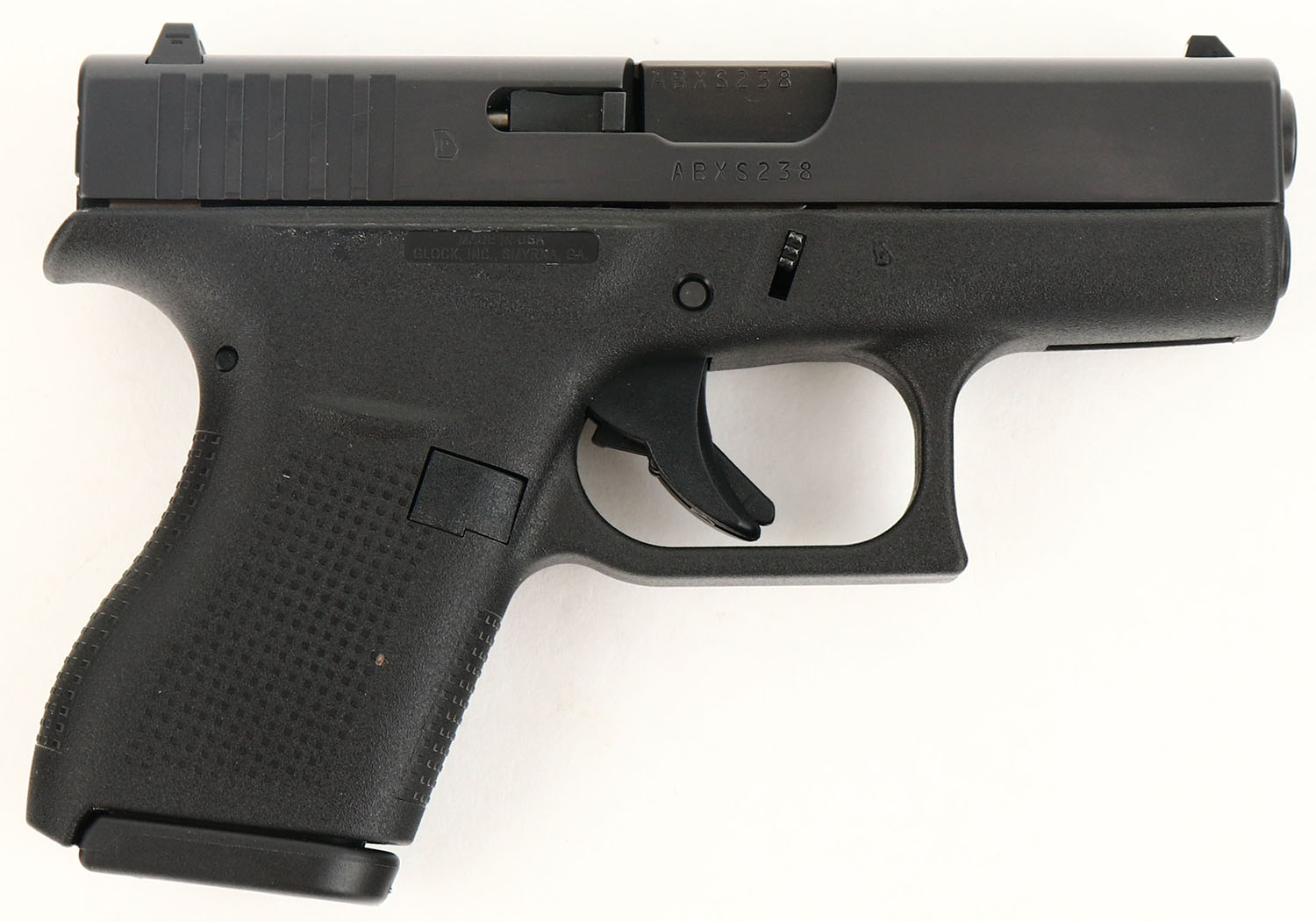 CASED, Glock, Model 42 Gen 4, CAL: .380 Auto, MFG: Modern, SN: ABXS238, Semi Auto Pistol, 3 1/8'' barrel. The less aggressive RTF-4 frame is excellent. The matte black finish on the slide rates 99%+. Bore is excellent. Factory contrast sights. Comes in factory hard case, with owners manual, extra mag & cleaning rod/brush. FFL Req. - Value: 300 to 450