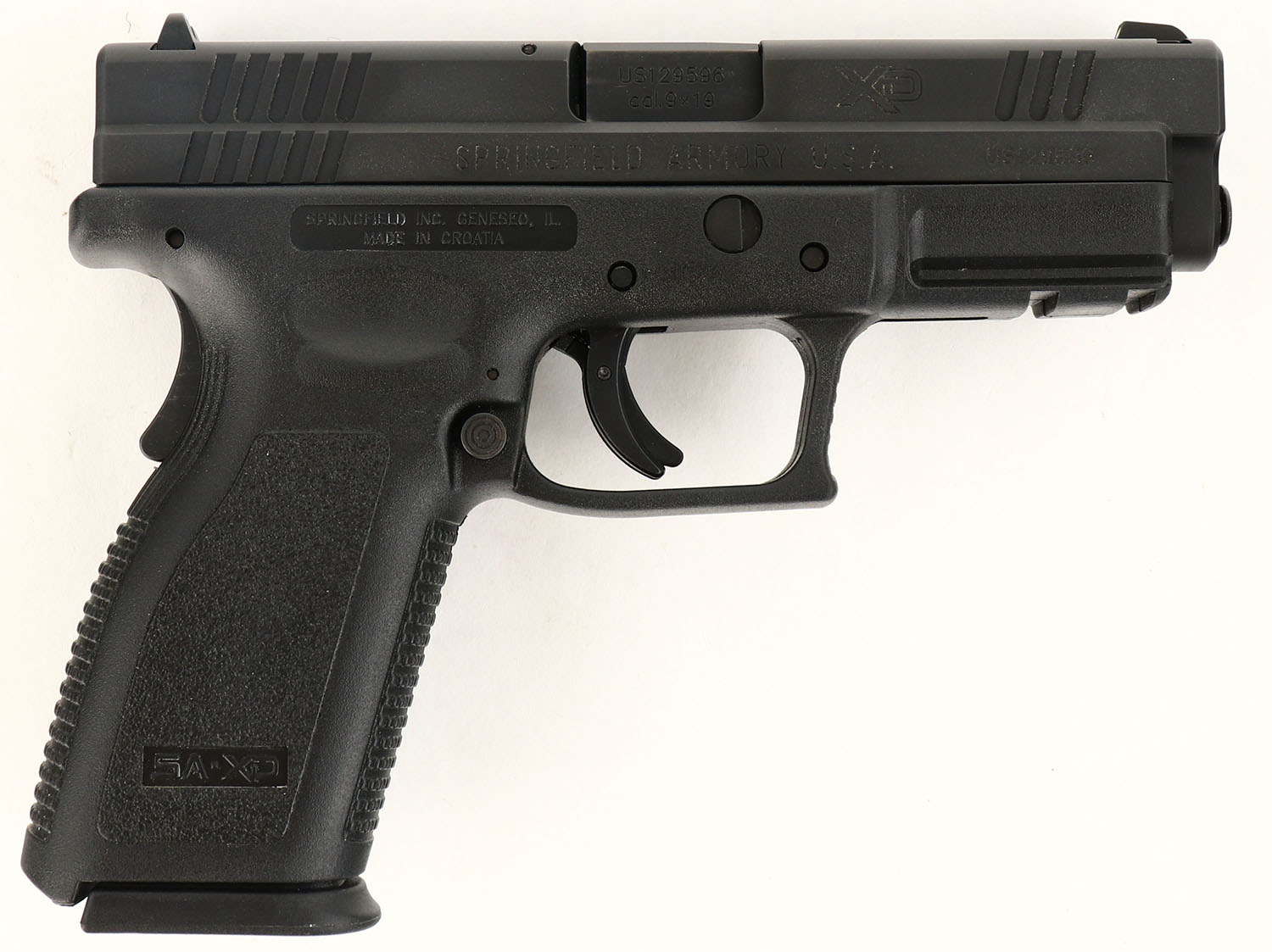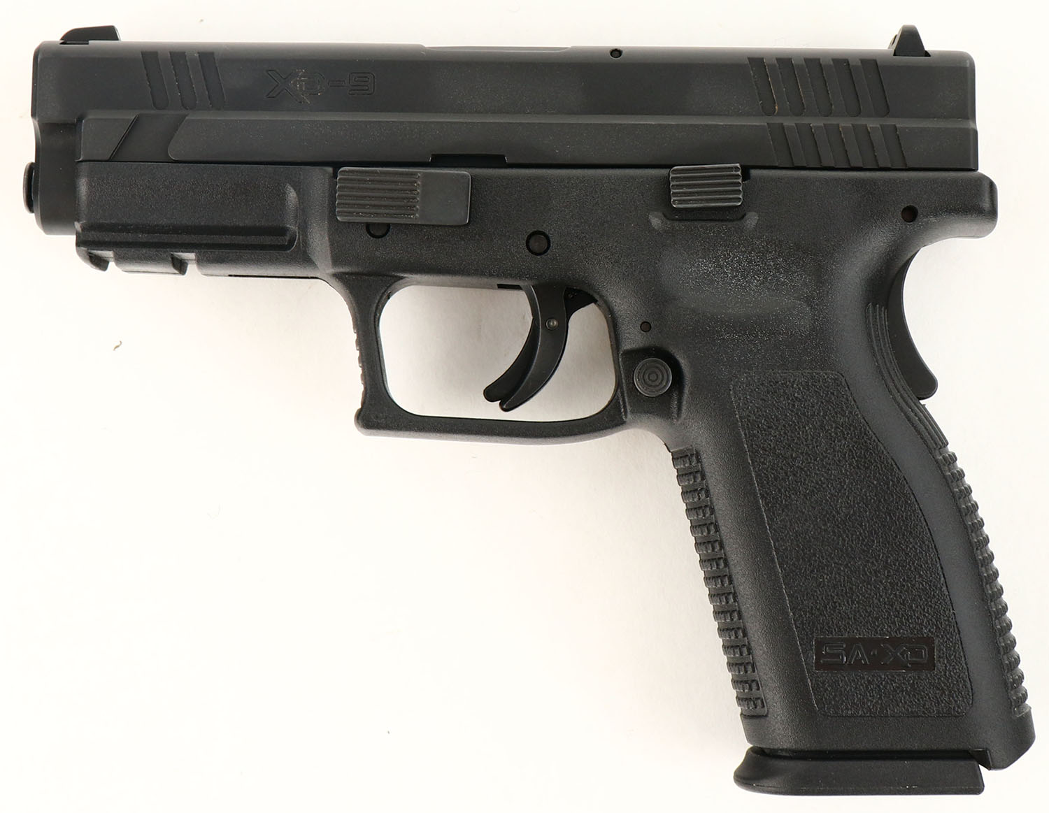 Springfield Armory, XD-9, CAL: 9mm, MFG: Modern, SN: US129596, Semi Auto Pistol, 4'' barrel. The synthetic textured & checkered grip frame is excellent. The matte black Melonite finish is excellent. Bore is excellent. Factory contrast sights. Comes in non-factory hard case, with two extra mags. FFL Req. - Value: 350 to 450