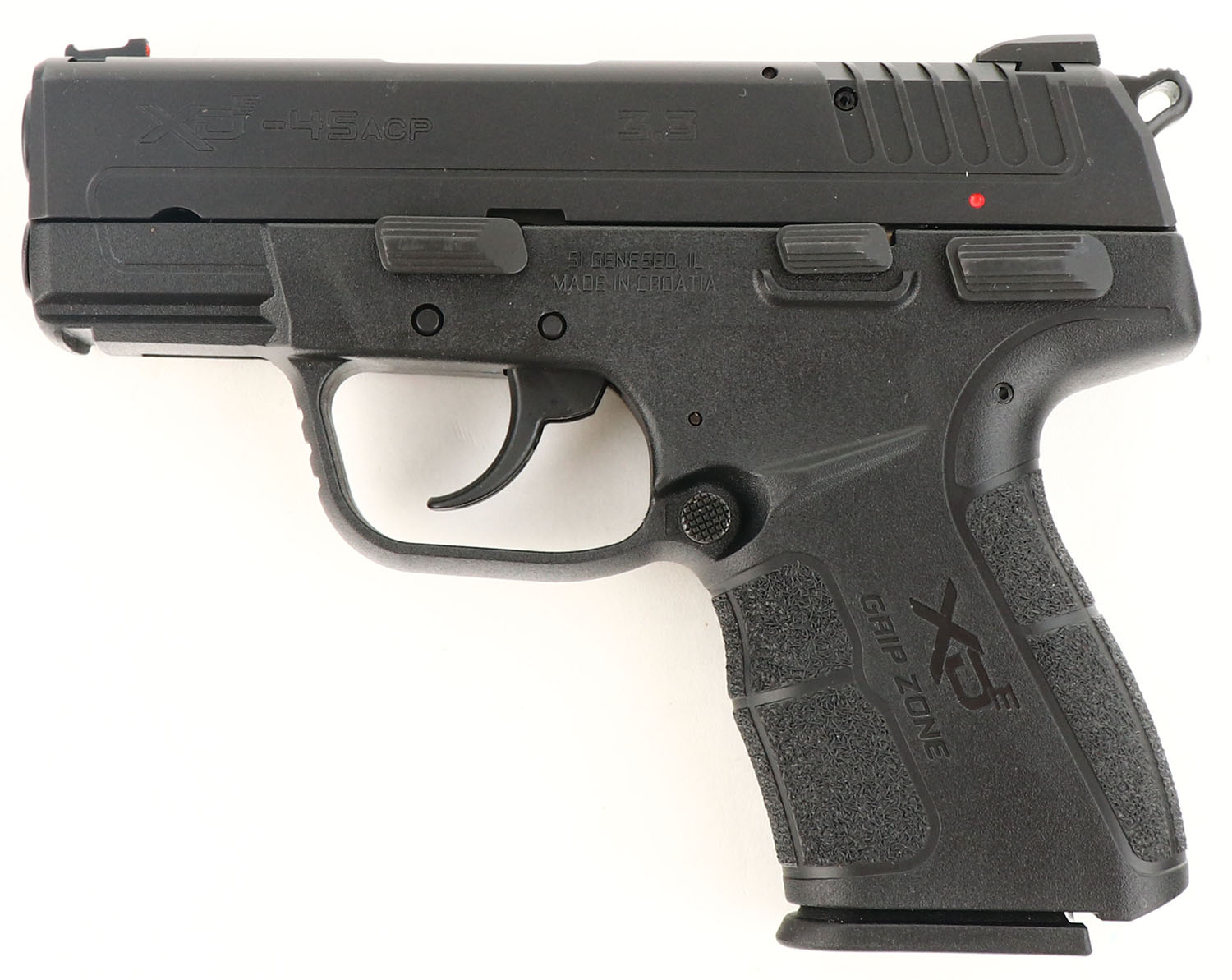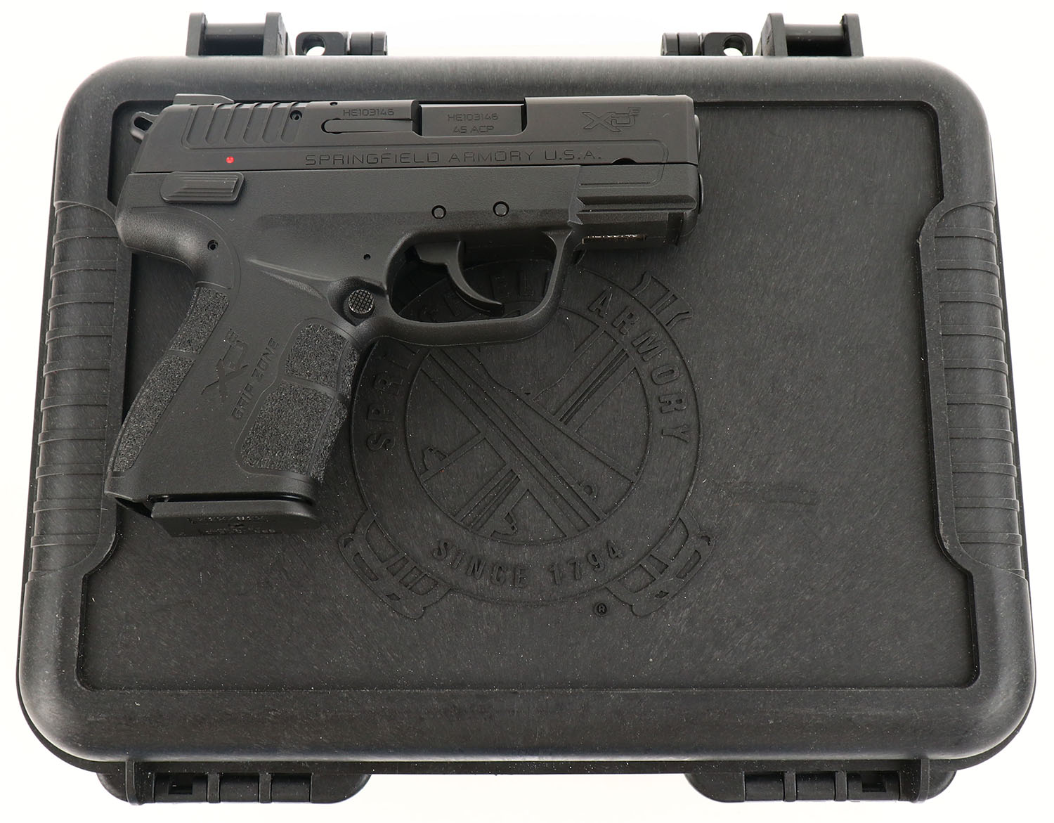 CASED, Springfield Armory, Model XD-E3.3, CAL: 45 ACP, MFG: Modern, SN: HE103146, Semi Auto Pistol, 3 1/4'' barrel. The textured synthetic polymer grip frame is mint. The matte black Melonite finish on the slide is mint. Bore is excellent. Factory contrast sights. Comes in factory hard case with paperwork, extra mag, grip extension & lock/key. NIB. FFL Req. - Value: 300 to 500