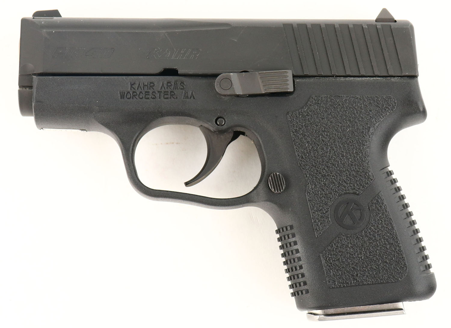 CASED, Kahr Arms, PA40, CAL: 40 S&W, MFG: Modern, SN: JA4173, Semi Auto Pistol, 3'' barrel. The textured synthetic grip frame is excellent. The Diamond Black finish on the slide is excellent, with some minor handling marks. Bore is excellent. Factory contrast sights. Comes in factory hard case, with related paperwork, extra mag & trigger lock. FFL Req. - Value: 300 to 600