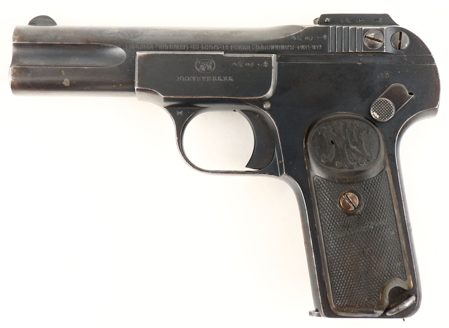 FN Belgium, M1900, CAL: 32 ACP, MFG: 1903-07, SN: 391579, Semi Auto Pistol, 4'' barrel. Standard markings on the left side of the slide & frame. Proofs on the frame, slide & left side of rear sight. Full SN can be seen on the right side of the frame, slide & right side of rear sight. The FN checkered plastic grips are very good & solid. There is a small hole in the ''FN'' of the left grip, along with minor contusions & scrapes. The original metal blue finish rates 60% on the barrel & 70% on the frame, with areas worn to metal gray & toned to a brown patina. Bore is good, with consistent roughness & thinned rifling. V-notch rear sight & blade front sight. FFL or C&R Req. - Value: 300 to 600