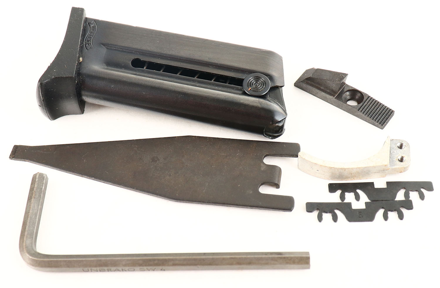 Walther, GSP Target, CAL: 22LR, MFG: 1975, SN: 62699, Semi Auto Pistol, 4 1/2'' barrel. The original oversized textured target grips are excellent. The satin/matte black finish rates 98% overall. Bore is excellent. Adjustable rear sight & ramp elevated blade front sight. Comes with an extra mag, tools & spare parts. FFL or C&R Req. - Value: 1000 to 1500