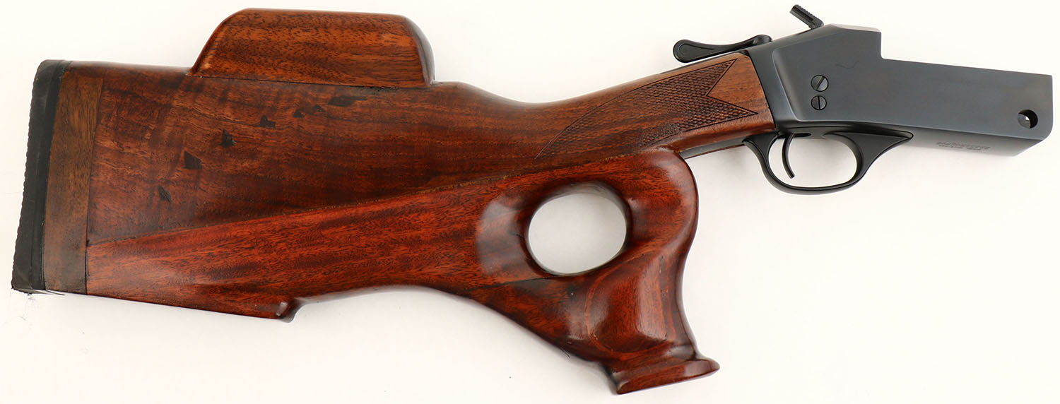 Henry Repeating Arms Company, Model HO15-223 Single Shot Frame, Caliber: 357 MAG/ .38SPL, MFG: Modern, SN: 223SSR02895, Break Action Single Shot Rifle Frame, The factory stock has been heavily custom modified, with the addition of a thumb hole pistol grip, an added block for increased length & an ultra high comb cheek piece. The stock has a solid recoil pad. Shoulders nicely. The individual who created this unusual configuration was quite the wood worker! Original frame blue rates 98%. Just need interchangeable barrels to make into numerous caliber options. FFL Req. - Value: 100 to 200