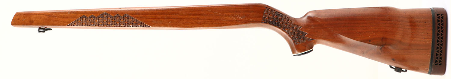 Unknown bolt rifle stock, Original finish, skip-line checkered capped pistol grip, Supreme ventilated butt pad, sling loops, slanted forend tip. Grade: Very Good - Value: 10 to 50