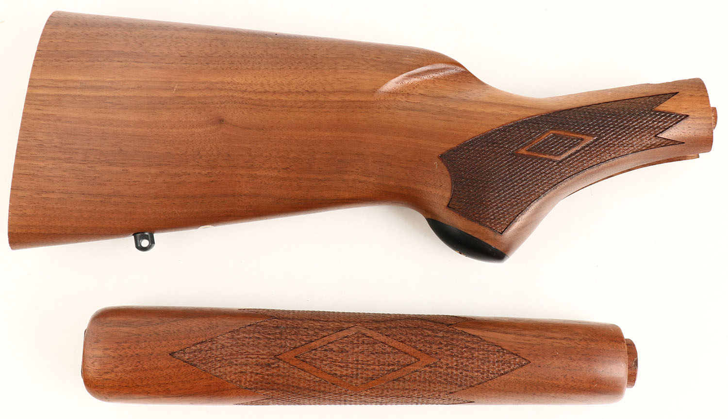 Marlin Model 336 wood stocks. Two piece, checkered, capped pistol grip, rear sling stud, minor storage marks. Grade: Excellent - Value: 100 to 200