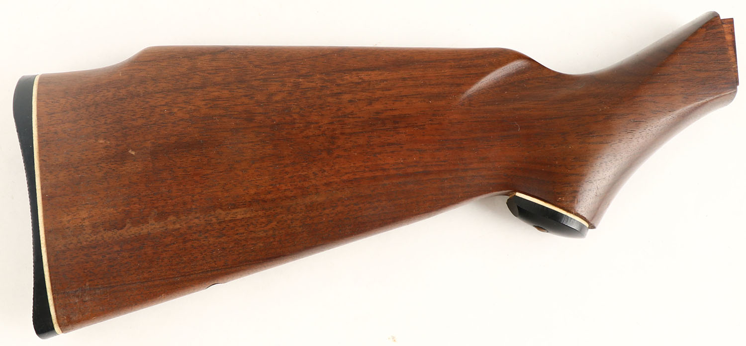 Marlin model 49, .22 take-off stock, Factory capped pistol grip, Monte Carlo style. Factory finish is very good, with some chemical runs on the finish. Very few blemishes. Marlin buttplate, with whiteline spacer on pistol grip cap & buttplate. Open sling stud hole. Grade excellent. - Value: 10 to 50