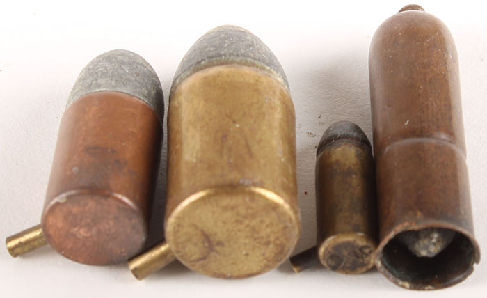 Lot of 4. (1) 5mm Pinfire, HS:''G 5'', RN Lead, brass case. (1) 9mm Pinfire, HS:''9'' impressed, RN Lead, Copper case. (1) 12mm Pinfire, HS: indistinguishable, RN Lead, brass case. (1) 32 Nation Teatfire, NHS, Flat teat, copper case. Grade: Very Good - Value: 20 to 40