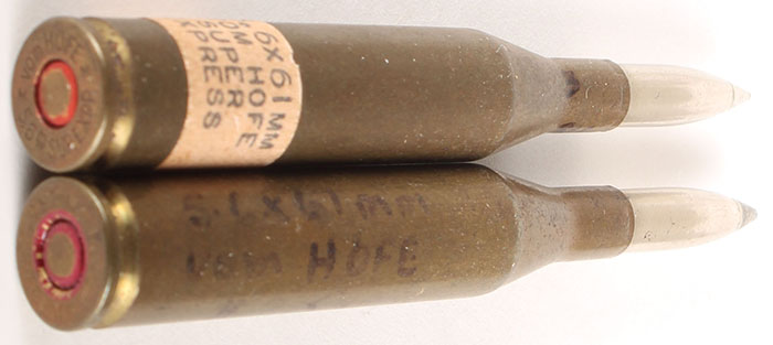 Lot of 2. 5.6x61 Vom Hofe Rimless. (1) HS:''vom HOFE F 5,6 SUPER EXPR F''. (1) HS:''vom HOFE R 5,6 SUPER EXPR R''. Both are PT CN FMJ. Grade: Very Good - Value: 10 to 40