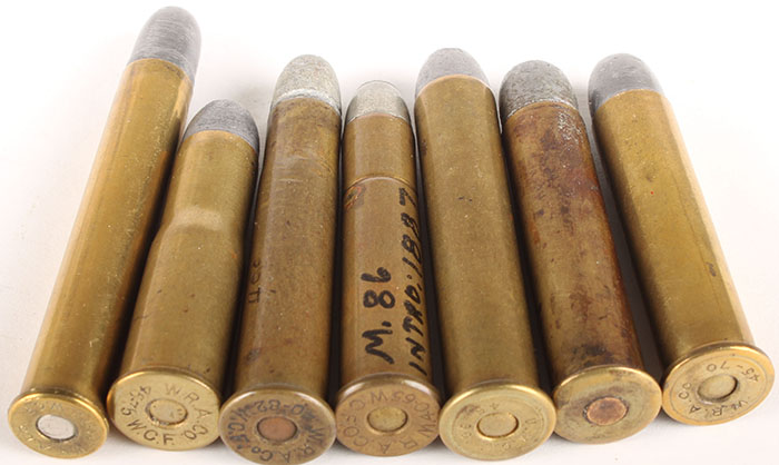 Lot of 7 US Sporting Cartridges. (1) 40-65 Winchester, HS:''W.R.A.CO. 40-65 W.C.F., FM CN SP. (1) 40-82 Winchester, HS:''W.R.A.Co. 40-82 W.C.F.'', RN Lead. (1) 40-82 Winchester, HS:''W.R.A.Co. 40-82 W.C.F.'', FN Lead. (1) 45-70 Govt., HS:''W.R.A. Co. 45-70'', RN Lead. (1) 45-70 Govt, NHS, RN Lead, Farrington primed by USC. (1)45-75 Winchester, HS:''W.R.A.Co. 45-75 W.C.F.'', FN Lead. (1) 45-90 Winchester, HS:''U.M.C. 45-90'', FN Lead. Grade Excellent. - Value: 30 to 50