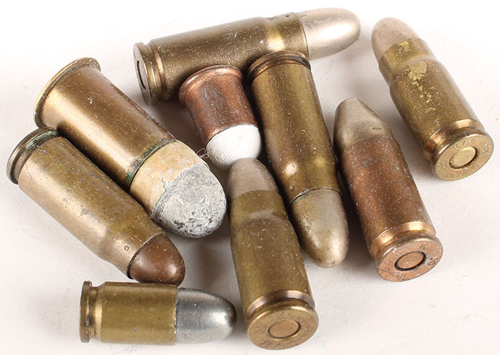 Lot of 9. European Cartridges. (1) 10.4 Swiss Ordnance Revolver, NHS, RN PP Lead. (1) 9mm Flobert, HS:''W'' impressed, RN Lead. (1) 7.65 Roth Sauer, HS:''W.R.A.Co 7.65 R. S.'', RN CN FMJ. (3) 7.63mm Mauser Pistol, HS:''DWM K 403 K'', 2--RN CN FMJ, 1--RN CJ FMJ. (2) 7.65 Luger, HS:''DWM K 471 K'', 1--FN CN HP, 1--RN CN FMJ. (1) 9mm Parabellum, HS:''DWM K 10 14'', Truncated CN FMJ. Excellent - Value: 20 to 40