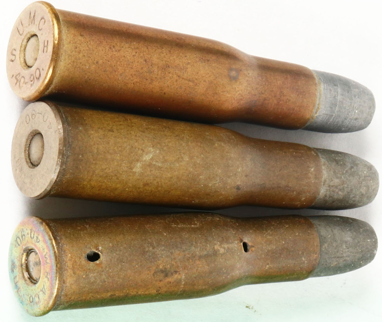 Lot of 3. 40-90 Bullard. (1) HS:''U.M.C. H 40-90 S'', FN Lead. (1) BULLARD 40-90, FN Lead. (1) HS:''W.R.A.CO. BUL. '', FN Lead Board Dummy with two mounting holes. Grade: Very Good - Value: 60 to 100
