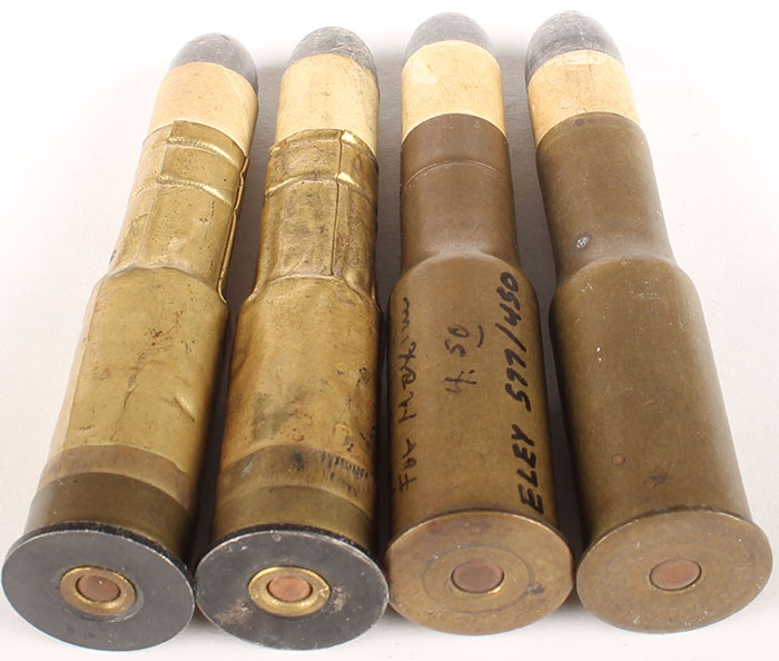 Lot of 4. 577/450 Martini Henry. (2) Coil Case military cartridges---1 by Kirkee and the other by Royal Labs. (2) Commercial drawn cases by ELEY. HS:''ELEY 577/450'', RN PP Lead. Grade: Very Good - Value: 30 to 60