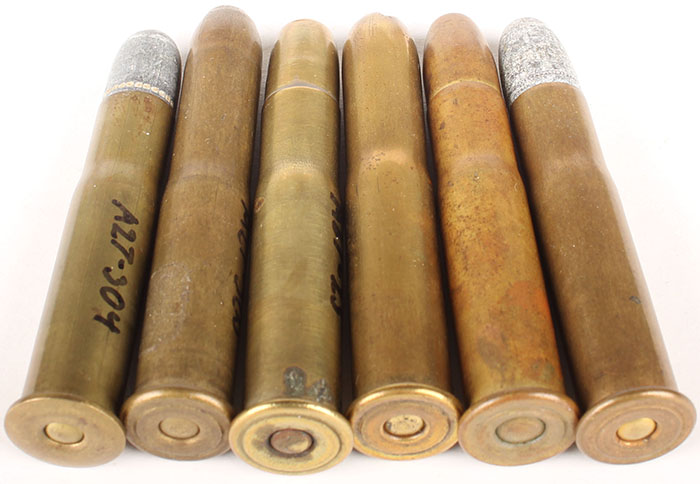 Lot of 6. 43 Spanish. (2) NHS. RN Lead, one each from Winchester and US Cartridge. (2) Extended length blanks, NHS, 1--Six petal crimp & the other narrow mouth with card wad 1.1'' down case. (2) Dummies with brass mock bullets (different types. Grade: Very Good - Value: 30 to 60