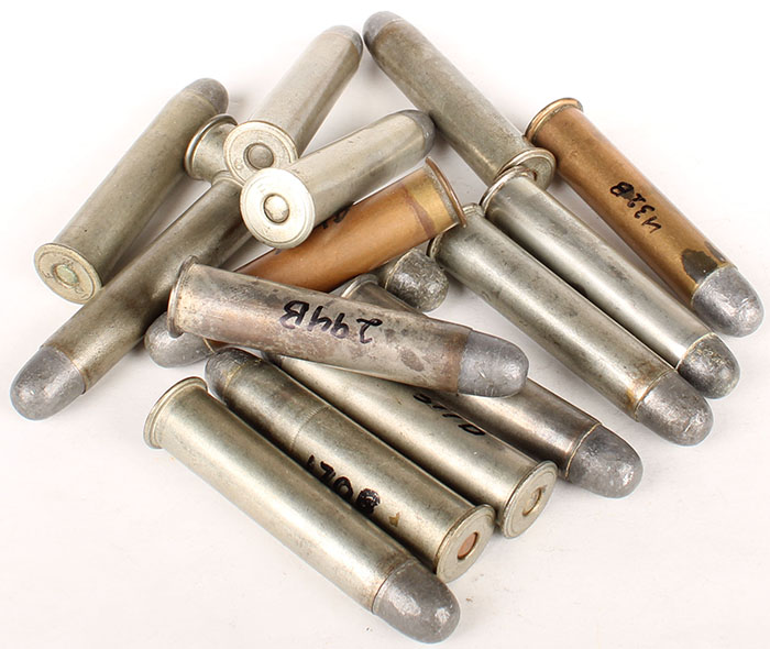 Lot of 15. .45 Government. All with 405 Grain RN Lead. Dates: 1888=12. 1889=4, 6, 11, 12. 1895=1. 1896=6. 1897=3,4,5 6,10, 1898=5. NHS=1, Smokeless Load with ratchet ring on case body and copper primer. Grade: Very Good - Value: 40 to 60