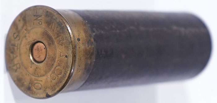 RARE Winchester No. 10 STAR, 10ga, loaded black paper shot shell, TW Selby 4 Excelsior, 2 1/2'' OAL, shell is solid. Grade: Excellent - Value: 30 to 300