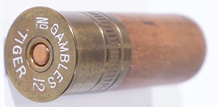 Gambles No 12 TIGER, tan paper shot shell, TW is hard to reed, 2 3/8''. Grade: Very Good ++ - Value: 6 to 30