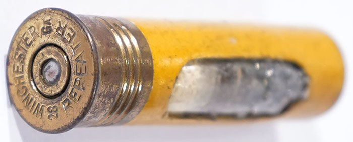 Window Shell, H/S= ''Winchester 28ga Repeater'' 2 3/8'' OAL, salesman sample in yellow paper case. Grade: Excellent - Value: 10 to 50