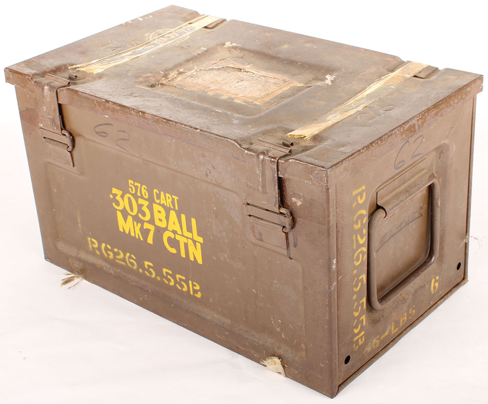 British, H50 MK1 steel ammo box, 1955 dated, empty, inside has a few spots of rust & stains. Grade: Very Good + - Value: 10 to 30