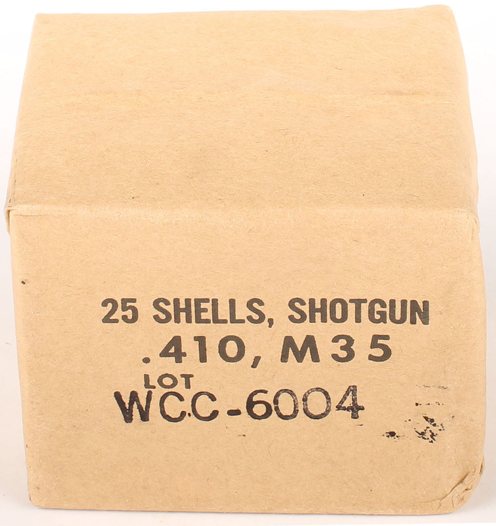 Western, .410 M35, Lot WCC-6008, foil wrap with inside box, FULL & foil wrap is SEALED, brown foil with black print, wrap is solid with light rub wear & light edge/corner wear. Grade: Excellent + - Value: 30 to 60
